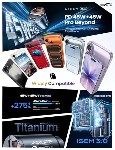QC45W+PD45W Super Fast Charger: AINOPE USB C fast car charger which has dual ports PD 3.0 (45W) & QC 3.0 (45W) to optimize charging speed. Maximize the charging speed of your device.This samsung galaxy s25 ultra car charger makes the Samsung Galaxy S24 Ultra charging time from 0% to 92% in 30 minutes.This car fast charger usb c for iPhone 15 16 has been recognized by official USB-IF and Qualcomm and passes over 16 tests, allowing you to power your devices confidently.