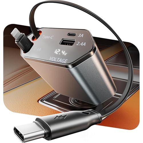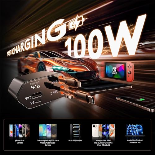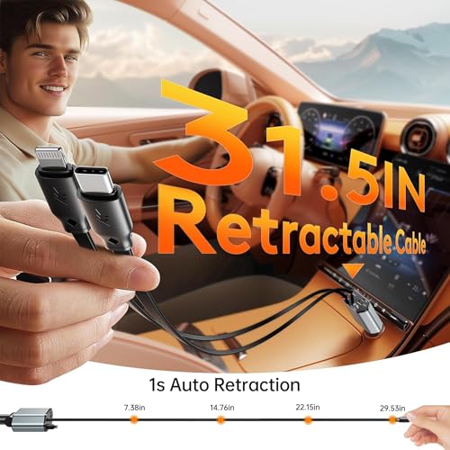 GUSGU 100W Retractable Car Charger, 4-in-1 Fast Car Phone Charger Featuring a 2.6ft Retractable Cord, with Lightning and USB-C Cable Car Charger Adapters, Compatible All Other Phone Models (Silver)