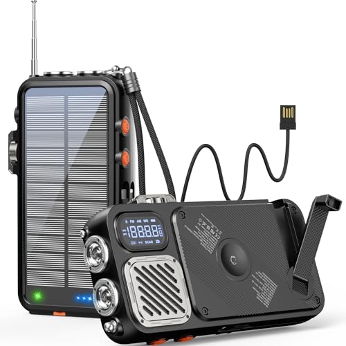 BROWEY Solar Power Bank Wireless Charger 16000mAh Built in Hand Crank and 3 Cables with Emergency Radio & Flashlight, 20W Fast Charging for Cell Phones, Portable Charger for Apple Watch