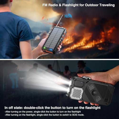 【Flashlight & FM/WB/BT/Clock modes】A LED flashlight with rugged cover design could light up your darkness.Built-in high-sensitivity FM radio chip with WB weather warning band, allowing you to know the bad weather in advance and prepare for disasters.The product has built-in Bluetooth function and can be connected to a mobile phone to play music.Equipped with a headphone jack, listening in public will not affect others.