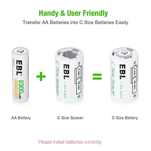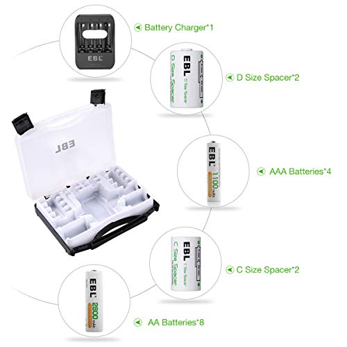 EBL Power Packages: EBL Family Battery Storage Case with EBL AA 2800mAh Rechargeable Batteries 8 Pack, AAA 1100mAh Rechargeable Batteries 4 Pack, iQuick Individual Battery Charger, 2 C Battery Adapters, 2 D Battery Adapters.