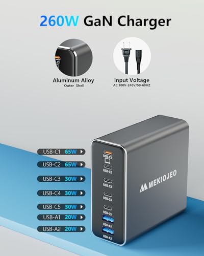 Aluminum Alloy 260W USB C Charger GaN Fast USB C Charging Station 7 Ports 65W Laptop Charger for MacBook Pro/Air/iPad Pro/iPhone (Gray)