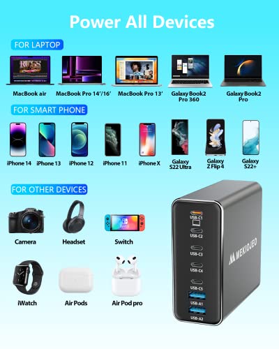 7-in-1 USB C Charger: This usb c charger block provides 7 charging wattage options with 5 USB-C ports and 2 USB-A ports. Such a usb c multiport charger can handle all your devices at fast speed with a total output up to 260W. What’s cool is that you can charge two laptops with our top two usb c ports of 65w.