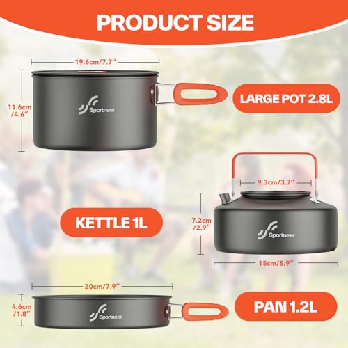 Camping Cookware Set: Sportneer Camping Cookware Set includes: 1 boiling pot (2.8L) + Kettle (1L) +1 frying pan (1.2L) +2 stainless steel cups+ 2 stainless steel plates+2 sets of dinner cutleries (2 x forks, 2 x knives, 2 x spoons) + 1 cleaning cloth + 1 Carry bag. Fully equipped and made for 1 to 2 people.