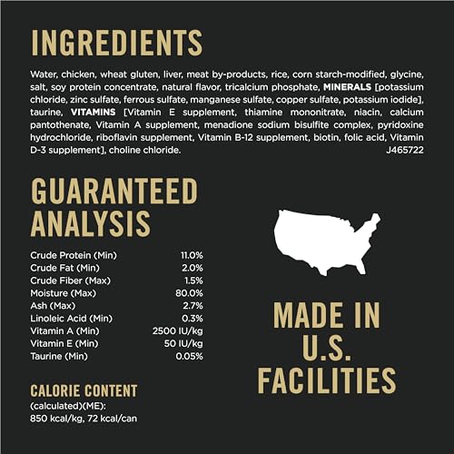Deliver delicious flavors to your cat’s dish with Purina Pro Plan COMPLETE ESSENTIALS Chicken and Rice Entree in Gravy adult wet cat food. This high protein canned cat food contains real chicken complemented with rice. Savory gravy adds flavor and moisture to every bite of this premium cat wet food made with no artificial colors or preservatives. Each serving of our chicken and gravy cat food contains antioxidants for a healthy immune system, and omega-6 fatty acids and vitamin A nourish her skin and coat. Vitamin A and taurine support healthy vision. Our high fiber cat food provides 100 percent complete and balanced nutrition for adult cats with an optimal protein level for maintaining an ideal body condition. Serve her the tempting taste, enticing aroma and tender texture of our chicken cat food with rice to enrich her dining experience, and feel the confidence that comes from giving her nutrition that performs. We proudly manufacture Purina wet cat food at Purina-owned facilities.