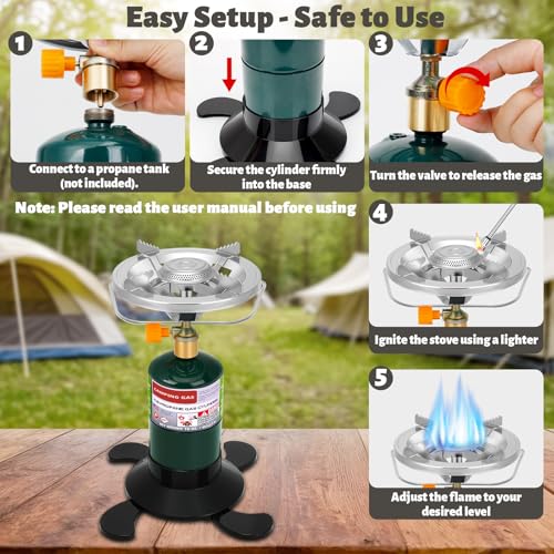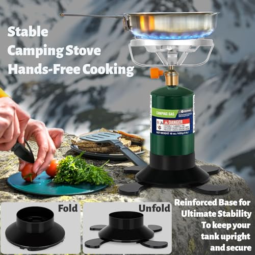 Extra Stable Camping Stoves Portable Propane: The propane camp stove comes with a foldable base that holds your 1 lb propane cylinder securely in place, providing added stability during cooking. The base of single propane burner with thoughtful additions enhances both safety and convenience, while folding down compactly for effortless storage and transport. Lightweight yet reliable, this portable propane stove is ideal for camping, backpacking, hiking, and emergency preparedness