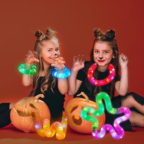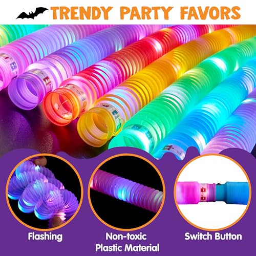 Value Set. Our glow sticks bulk party pack halloween set includes 12PCS Halloween LED light up pop tubes in 6 colors (Purple, orange, green, red, yellow, blue). 3 glowing modes, stay on, slow flashing, fast flashing, these LED glow sticks can be popped up, stretched, twisted, and turned at will, and can even be connected together as Halloween glow bracelets, Halloween glow anklet, Halloween glow necklaces and more.