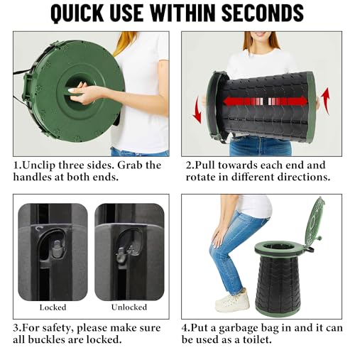 Stable and Secure: Our outdoor toilet is made of excellent improved polypropylene material, durable and weather-resistant. It can hold up to 880 pounds, at least twice the load-bearing of other portable toilets. A full-body safety lock buckles, internal retaining spring, and non-slip bottom ensure stability and safety, ensuring worry-free use.