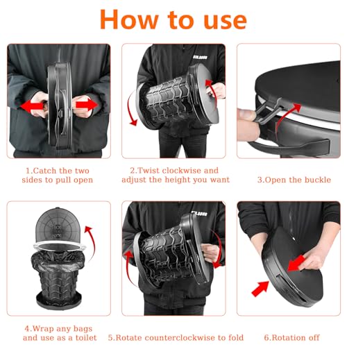 【Very Easy to Use】Benefiting from the fish scale design and our high precision production equipment, the folding toilet’s stretch and retract smoothly and easily. You can open and close the portable folding toilet in just seconds. What included in the package: 1 Portable Toilet, 10 Toilet Bags, 1 Waterproof Storage Bag