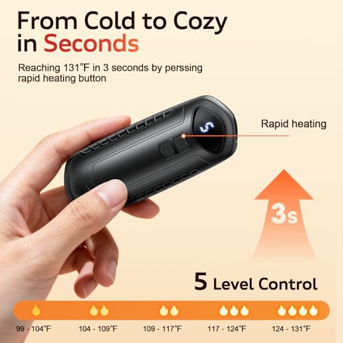 Smart Temperature Control and Rapid Heat – This portable hand warmer can heat up to 131℉ in just 3 seconds, while offering 5 precise temperature settings (95℉-131℉). The five temperature levels are suitable for those sensitive to temperature, allowing for a more accurate choice of the desired heat, such as gentle low heat for indoor office use and high heat for outdoor skiing. It also alleviates cold discomfort in the hands for patients with Raynaud’s disease, providing a mild heating experience