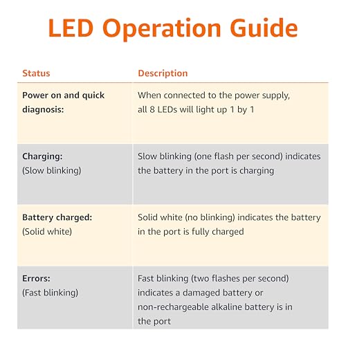 LED Light Indicator: 1) Battery is charging: LED blinks slow. 2) Battery is fully charged: LED is solid white. 3) The charger detects an error (defective battery or alkaline battery): LED blinks fast. 4) Every time the charger is connected to power all LEDs power up and power off in a quick sequence.