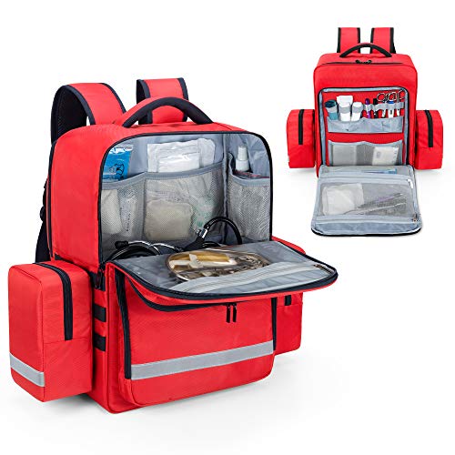 ORGANIZING NEATLY: Four grid compartments and a transparent zipper pocket inside the main compartment for better organization. Two detachable side pockets for necessary first aid supplies. Front compartment with elastic slots and mesh pockets secure your med gear.