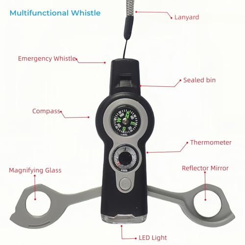 【7 in 1】 This special whistle has 7 functions including emergency whistle, compass, thermometer, LED signal light, magnifying glass, reflector, and miniature sealed compartment. The storage compartment is used to store important personal information, allowing rescue personnel to grasp your situation at the first time. In addition, if assistance is needed in an emergency situation, simply whistle lightly, which is louder and more effective than blowing the whistle with full force.