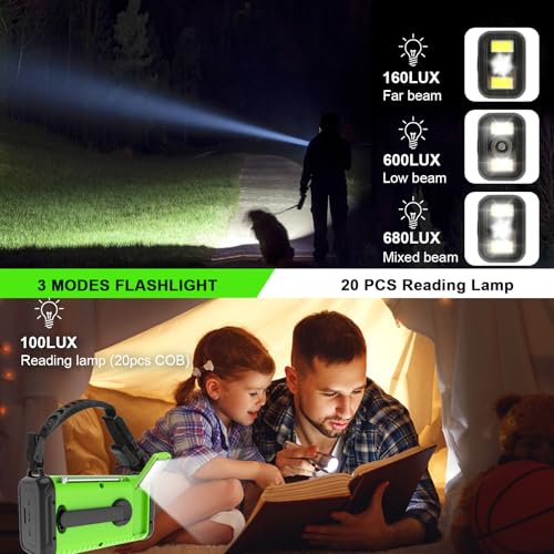 [3+1 Bright LED Light] Rckskaya emergency radio solar hand crank flashlight illuminate dark environments with a 3 mode flashlight (Fam beam,dipped beam and mixed beam) for home power outades or in car emergency kit. This hand crank radio solar flashlight cell phone charger helps you find a suitable photometric mode well for different scenes. 20 pcs reading light on the back of the crank radio is very bright, prefect for reading, camping, power outages, or emergency flashlight. Hand crank radio with IPX3 waterproof design withstands rain, dust, and drops for outdoor activities