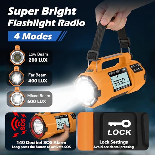 140dB SOS Alarm and 3-Mode Flashlight – Activate the emergency radio with a loud SOS alarm, 140dB siren, and red strobe light to attract the attention of search and rescue teams. This ultra-bright emergency flashlight offers 3 modes light ( Far beam: 400 LUX, Low beam: 200 LUX, Mixed beam: 600 LUX ) and strobe modes, perfect for power outages or wilderness emergencies. During hurricanes or blizzards, visibility is crucial, making it a crucial piece of survival gear for saving lives