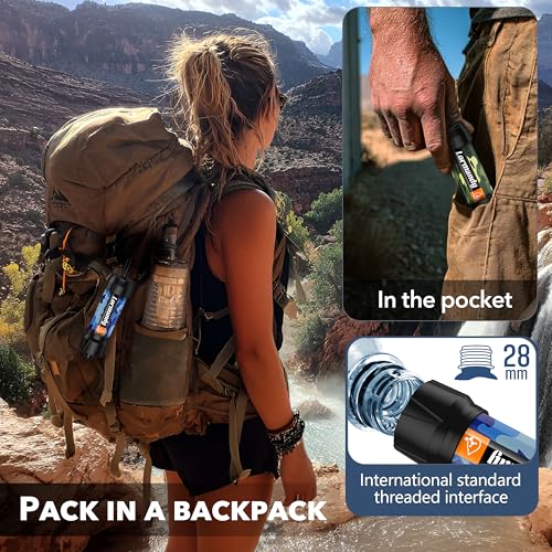 Wide application: The water filter can be connected directly to a drinking bag, bottled water, or water directly from an outdoor water source without any other attachments. Simple to operate, it ensures water safety for you and your family when you are outdoors (Easy to use and ideal for teaching survival skills).