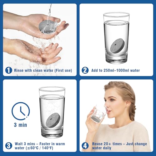 Simple & Efficient Usage with Clear Guidelines: Each 25g ceramic disc is effortless to use—simply rinse before the first use, then place it in your water container (8oz to 32oz). For optimal results, allow it to soak for 15-20 minutes at room temperature. With warmer water (up to 140°F), infusion time shortens to just 5-10 minutes. One disc is designed for up to 1000ml; add more discs for larger volumes. Each disc provides 20+ uses